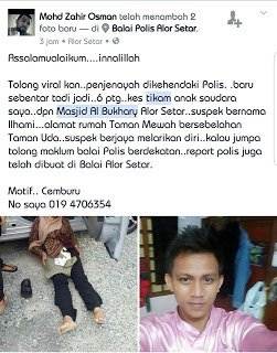 Polis kini sedang mengesan suspek yang berasal dari Jalan Tun Razak dan kes disiasat mengikut Seksyen 326 Kanun Keseksaan.