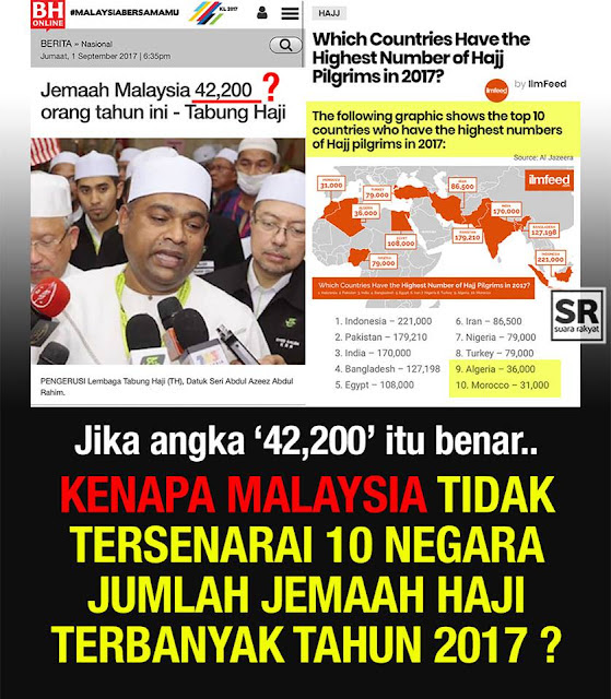 HAKIKATNYA, angka 42,200 dari Malaysia tidak wujud sama sekali pada fakta 10 negara jumlah jemaah haji terbanyak pada tahun 2017 !!!