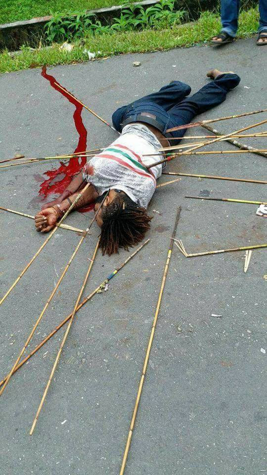 Dalam kejadian jam 5 pagi itu, mangsa, Melanesia Gwijangge. yang juga dari Kota Jayapura dikatakan pulang ke kampungnya di Timika pada ketika itu sebelum mangsa direjam dengan buluh oleh perang suku.